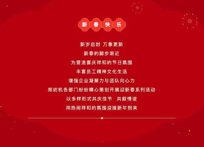 此次开展的迎新春活动,不仅为员工带来了节日的喜悦与关怀,更在轻松和谐的氛围中凝聚了团队力量,彰显了公司积极向上、团结奋进的企业文化。征途漫漫,惟有奋斗。未来,郑纺机将继续以文化聚人心、以创新强动力、以协同促发展,让每一位员工都成为企业发展的参与者、贡献者与受益者。全体郑纺机人将把节日里的喜悦与活力,转化为攻坚克难的实干劲头,凝心聚力、笃行不怠,为公司高质量发展注入更强动能!